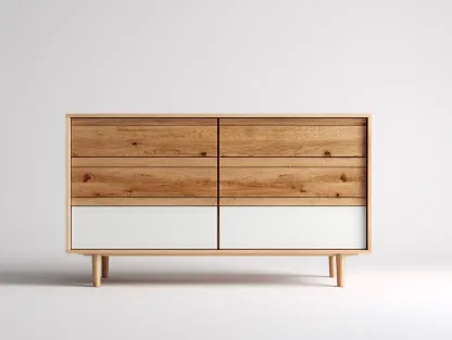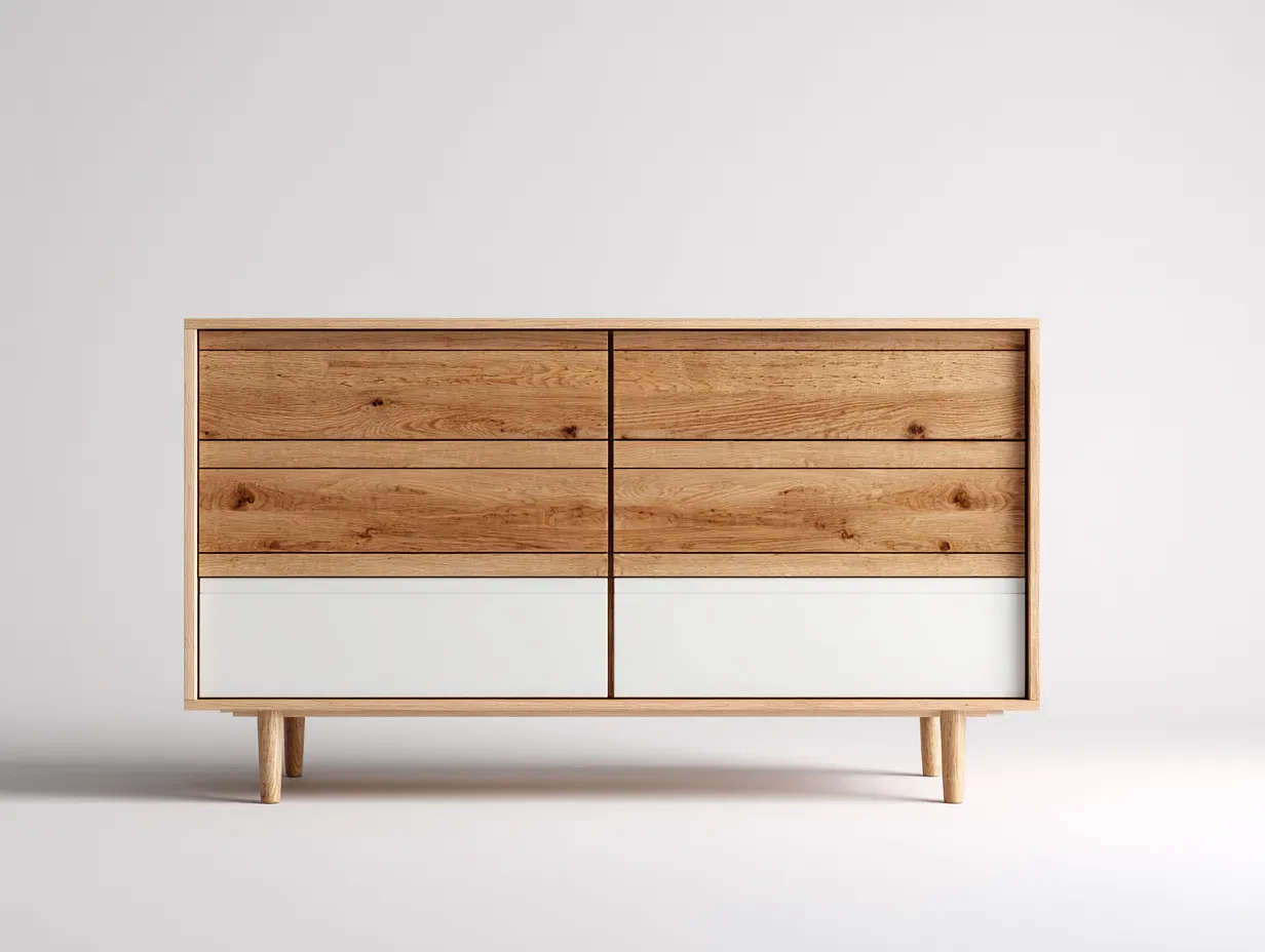 Cette commode est conçue pour organiser les vêtements et objets du quotidien dans une chambre ou un espace de vie. Son format large et bas permet une utilisation pratique tout en s'intégrant facilement dans différents styles d'intérieur.